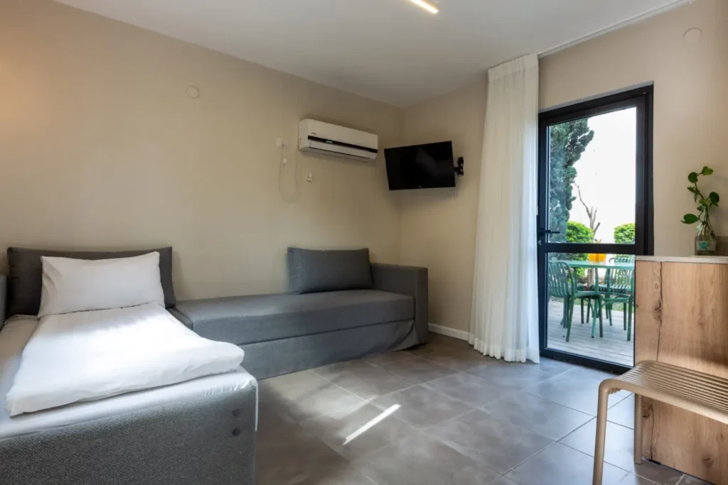 יחידות קרקע כ-38 מ"ר, עם יציאה למרפסת פרטית הבנויות חדר הורים (דלת מפרידה) וסלון. החדרים מיועדים לאירוח עד ל-5 אורחים ותינוק בלול. החדר שינה המרוהט בשתי מיטות ליחיד מחוברות כמיטה זוגית 160*200 ס"מ הניתנת להפרדה, ושידות. הסלון מרוהט עם 3 כורסאות יחיד מרווחות וארון בגדים.